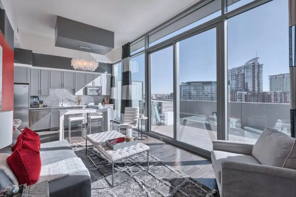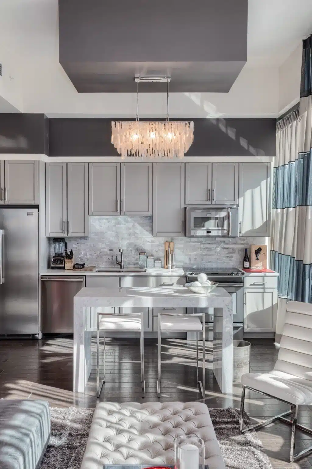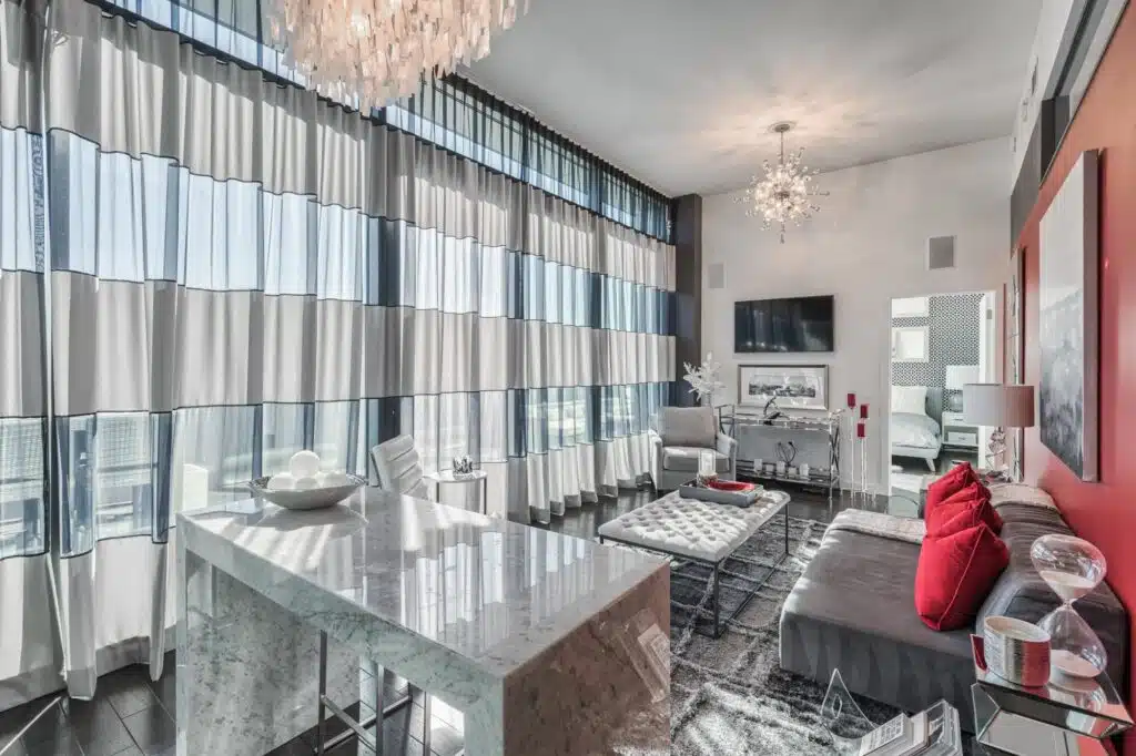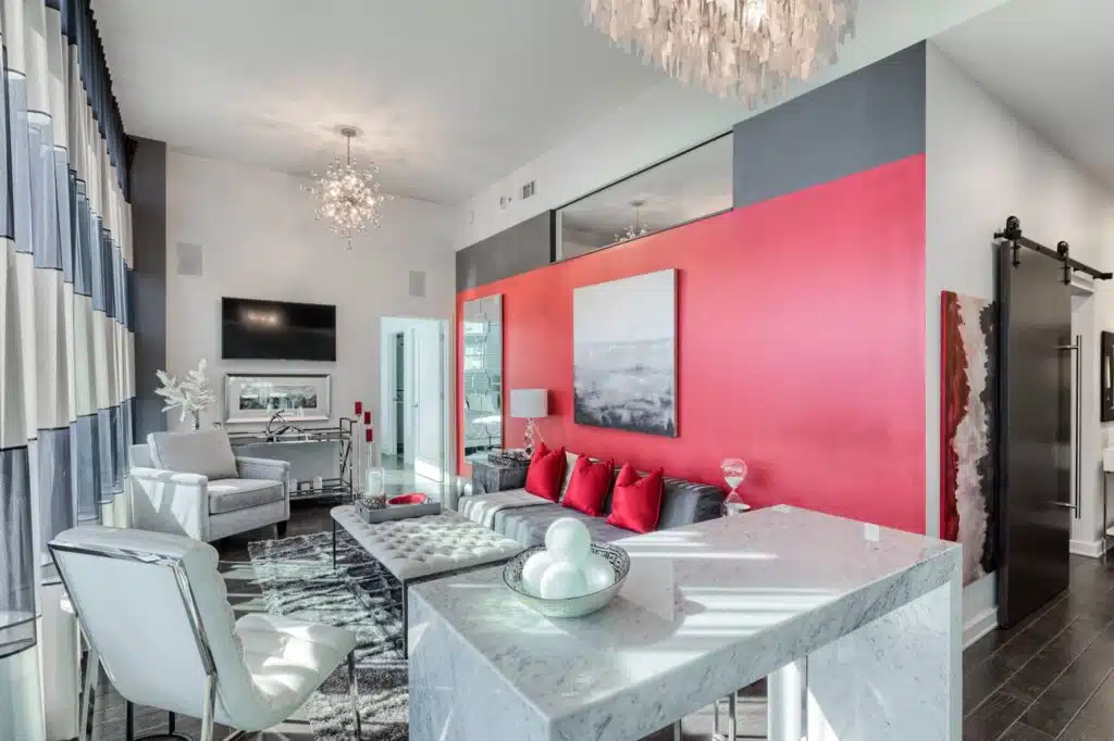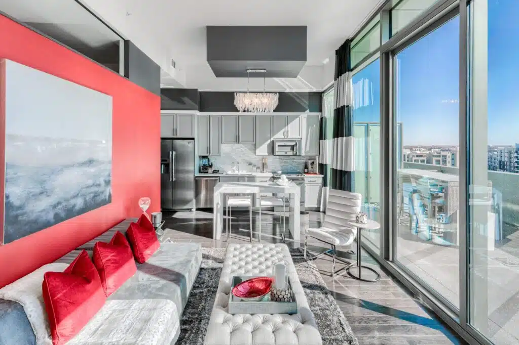 What’s black and white and red all over? This amazing condo in the heart of Nashville, Tennessee! Creating a movement within a space was the goal from the minimal yet highly effective pops of color and pattern. Customizing draperies that accentuate the architectural details and line of the space bring to life the full height wall of windows by the touch of a button. We commissioned original art to even be a fixture of moving parts in this chic upper floor palace. From the versatility of the spaces to the furniture, this space truly does everything and more. Playing on line, color, and pattern were key in bringing about the principles of variety, emphasis, and balance.